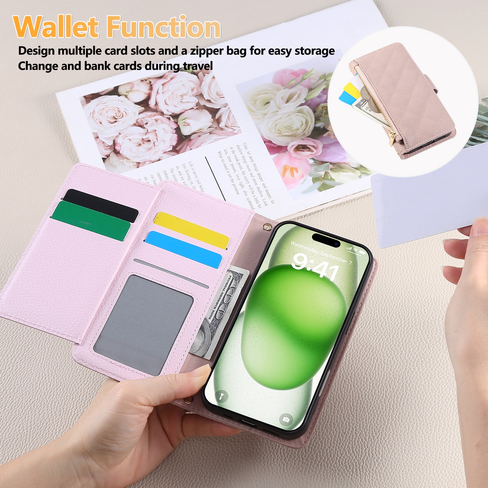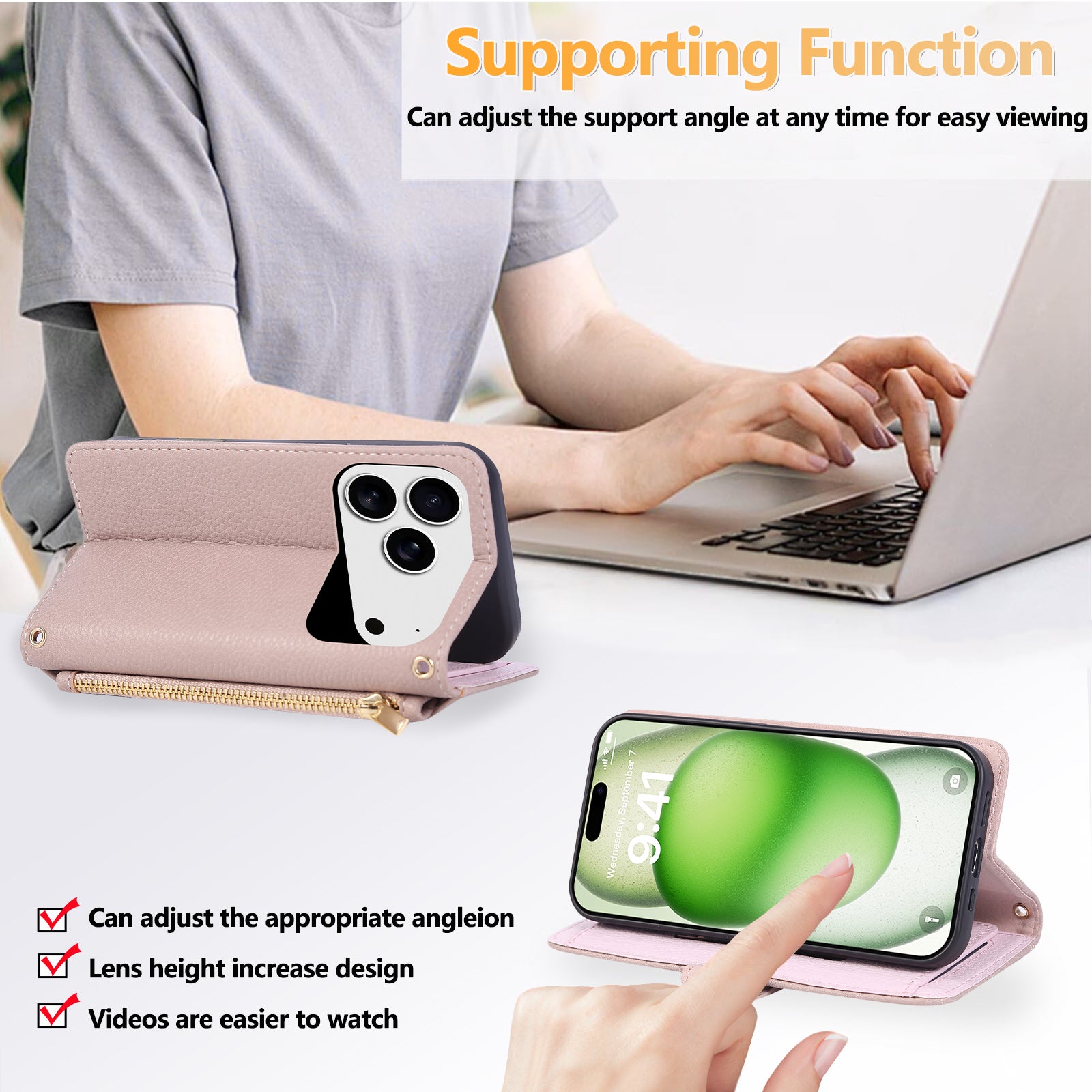 Elegant leather case with a zip card pocket, built-in mirror, foldable stand, and adjustable crossbody strap—stay organized, stylish, and hands free anywhere.