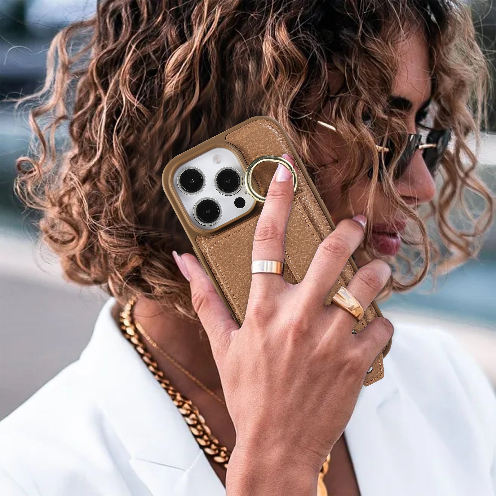 Durable leather case with a capacity card pack, built-in hand-grip holder, and adjustable strap—carry essentials with ease while keeping your phone secure and hands free.