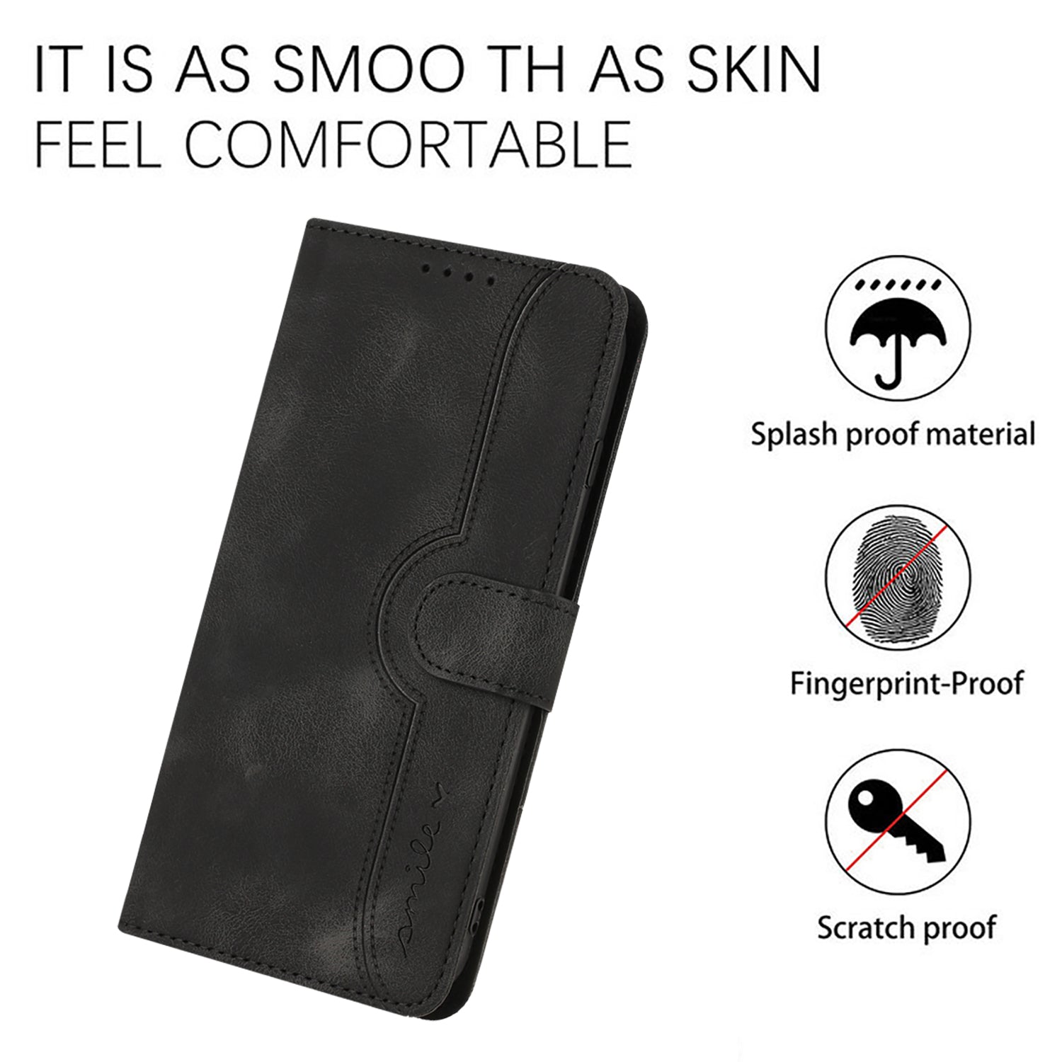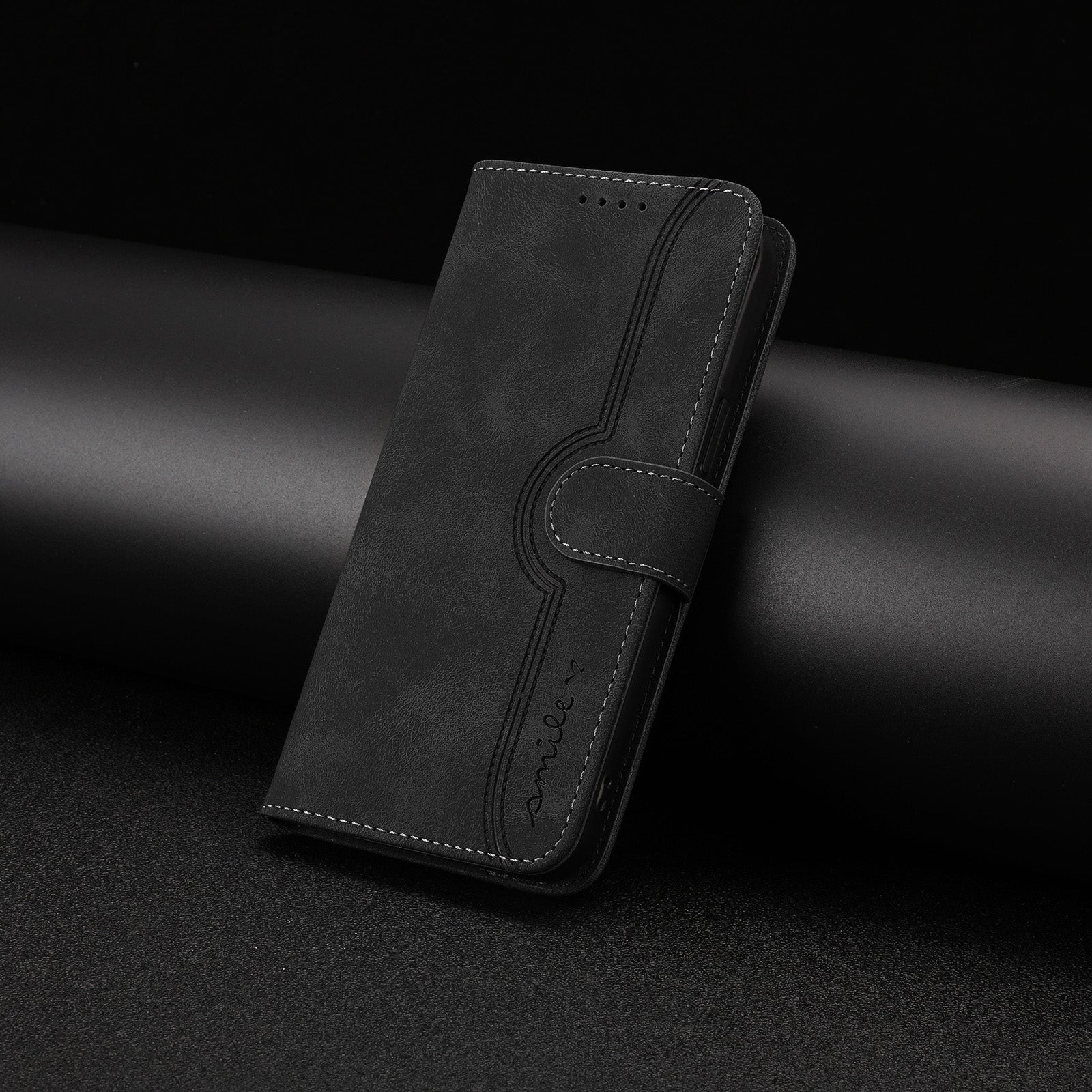 Textured black leather case with card and cash storage, magnetic closure, foldable stand, and wrist strap—stay organized, hands free, and effortlessly stylish every day.