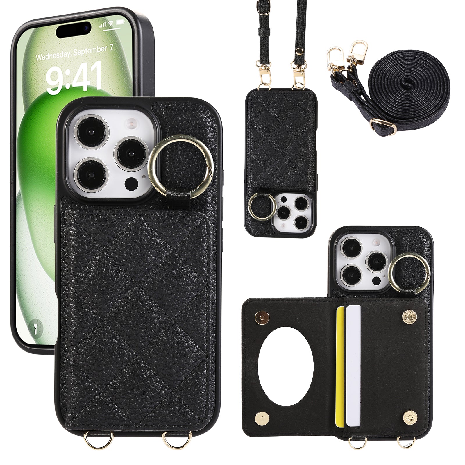 Leather iPhone Cases With Card Holder And Strap(With Mirror)Black-BC25033