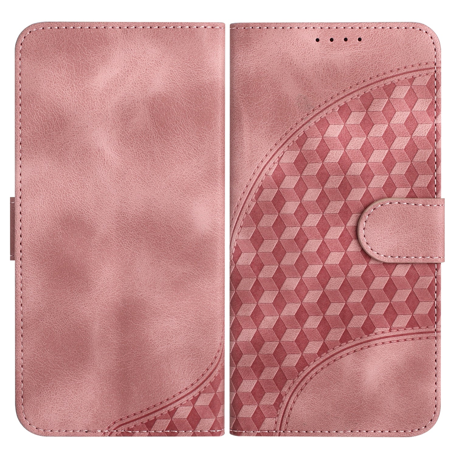 Playful pink leather case with card and cash storage, magnetic closure, foldable stand, and matching wrist strap—stay organized, hands free, and full of lively style.