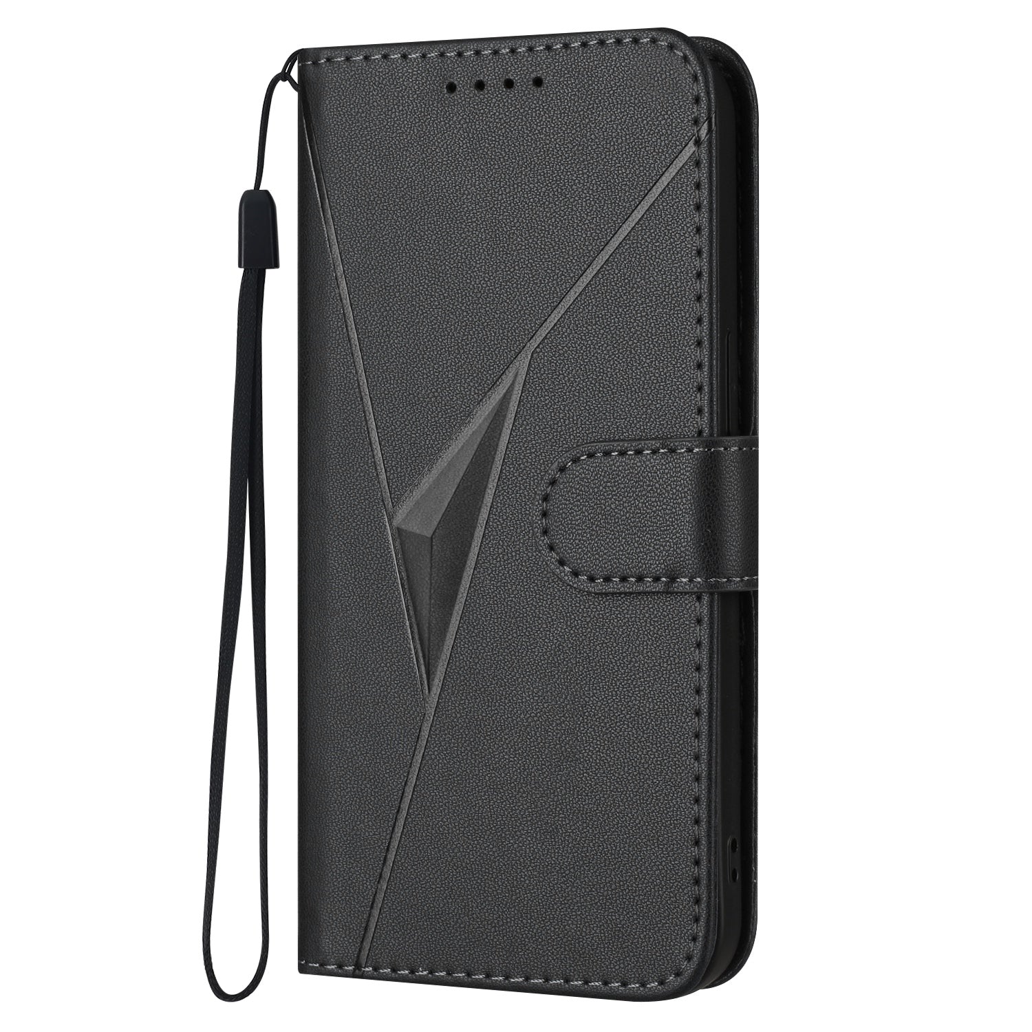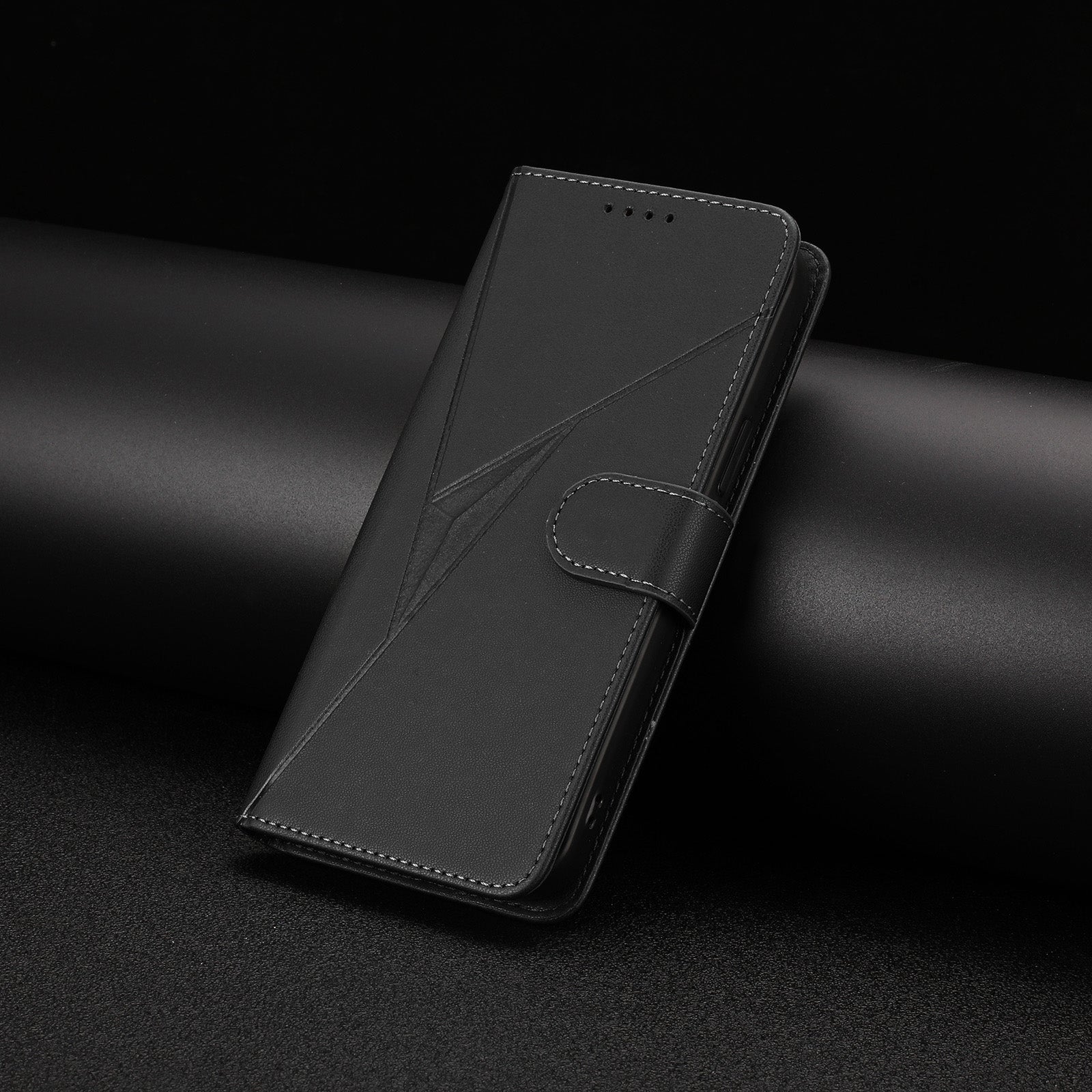 Chic black leather flip wallet case with card and cash storage, magnetic closure, foldable stand, and wrist strap—secure essentials with hands-free, modern style.